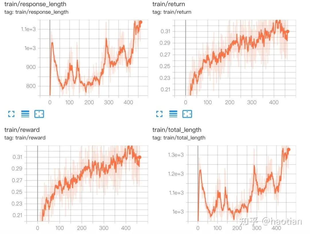 The results were compelling. Removing the Kullback-Leibler (KL) divergence constraint (by setting init_kl_coef=0 in OpenRLHF) led to steady increases in both reward and response length.