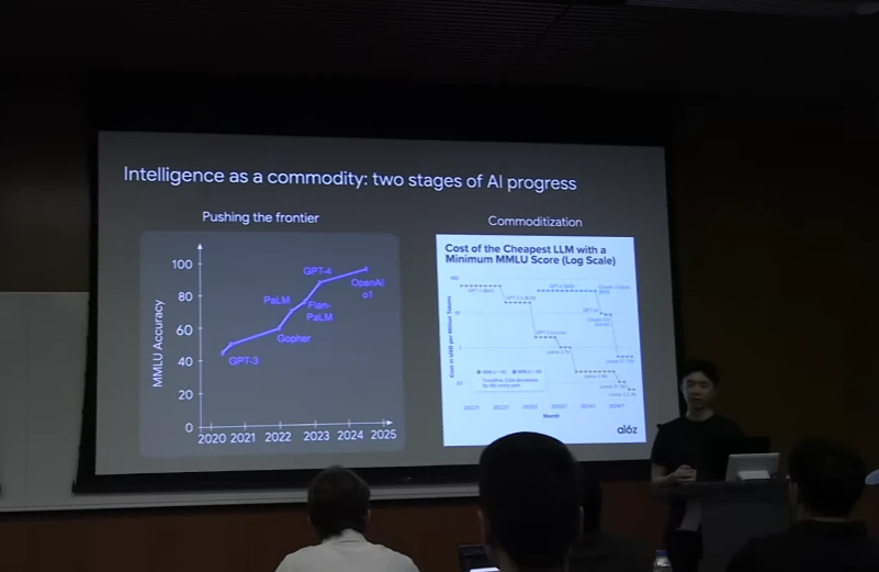 First, let's unpack the commoditization of intelligence. According to Wei, AI development unfolds in two distinct phases that explain the rapid drop in the cost of AI capabilities.