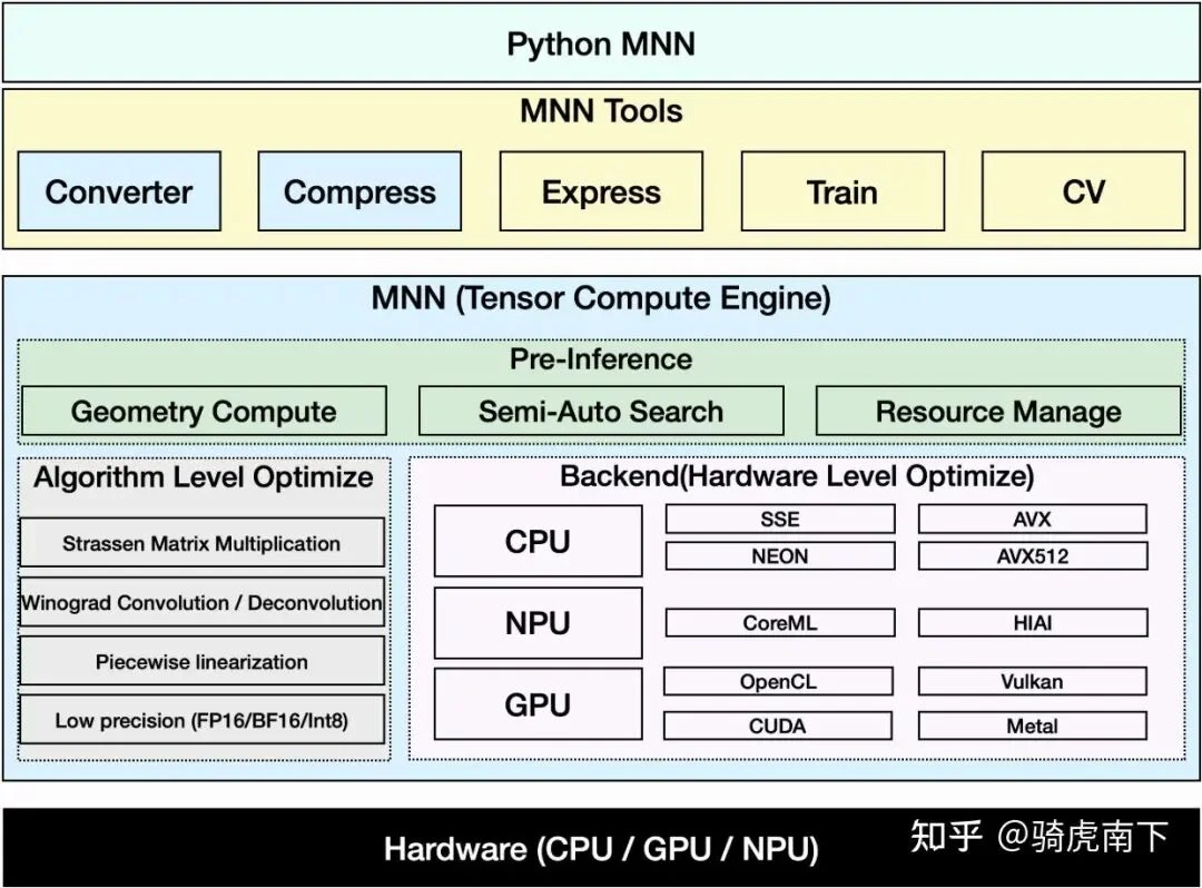 Backend & Operators: This is the computational core of the AI inference engine. It uses highly-tuned operators (e.g., Winograd for convolutions) and supports heterogeneous execution, intelligently scheduling operations across CPUs, GPUs, and NPUs using optimizations like Neon/AVX or acceleration via OpenCL/CUDA.